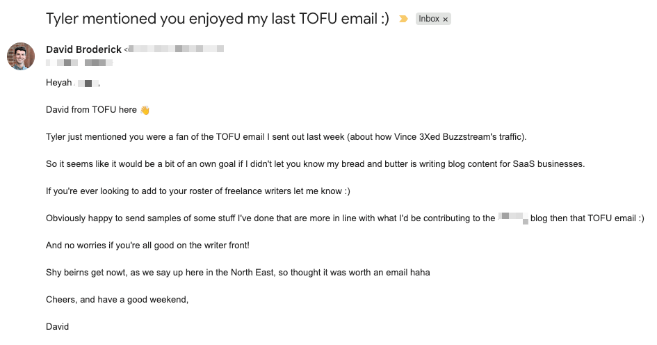 And a content lead at another SaaS biz who messaged Tyler to say he was a fan of one of my TOFU newsletters: