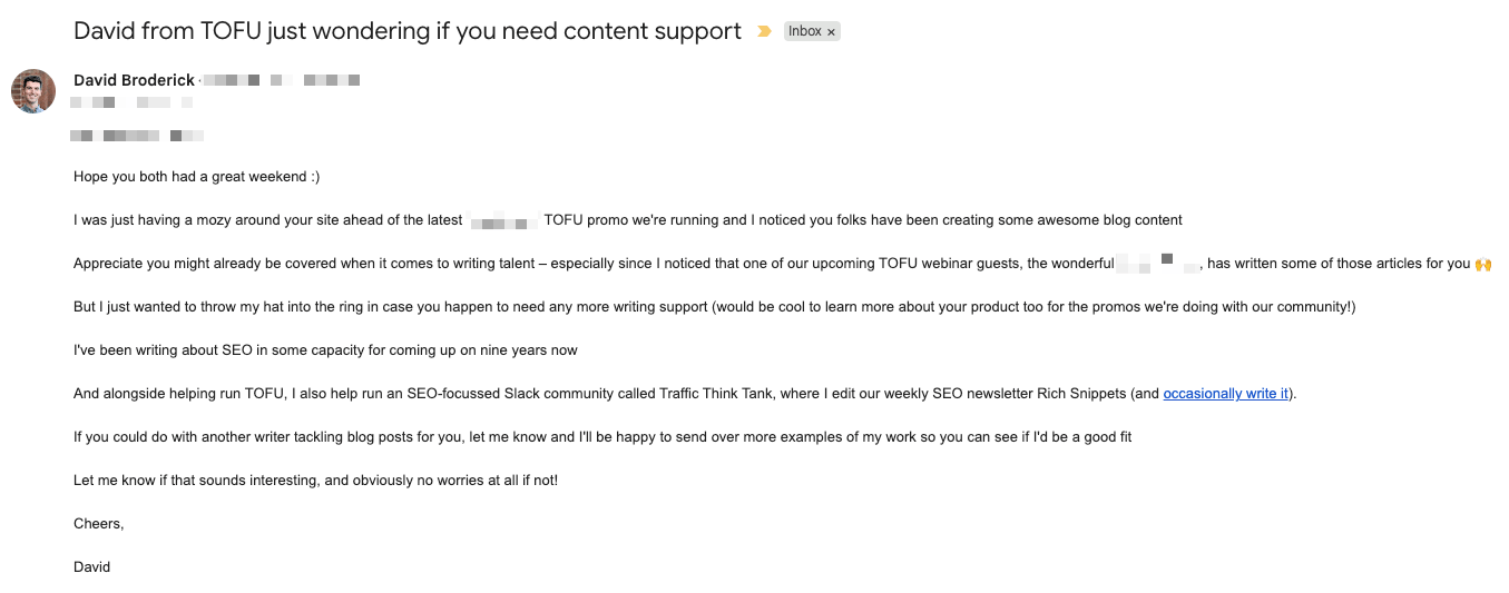As you can see, these pitches aren’t anything special. But they really don’t need to be when you're someone they know rather than a rando showing up in their inbox.