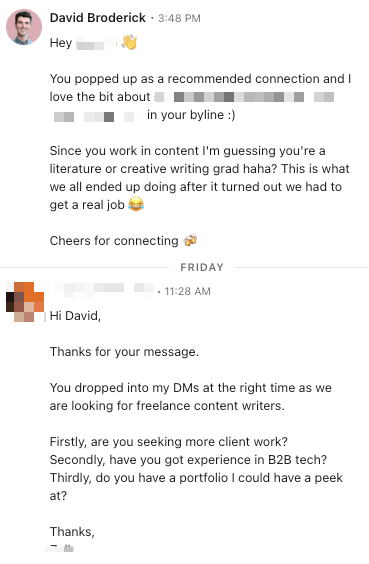 “Hey I’m looking for freelance writers to cover this topic you’ve written about tonnes. DM me if you’re a good fit.”