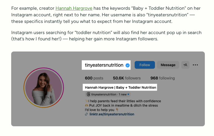 āWant to show up in more searches? Add one or two keywords that describe what you do right in your name field or handle ā think āvegan recipesā or āwedding photographer.ā Those words act like SEO for Instagram, making it easier for the right people to find you.ā
