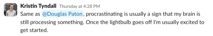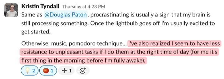 Kristin is a lot less affected by procrastination if she tackles her most dreaded tasks before her brain has had a chance to wake up properly: