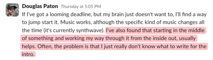 Douglas knows that if he’ll write an article faster if he skips the intro, then comes back to it: